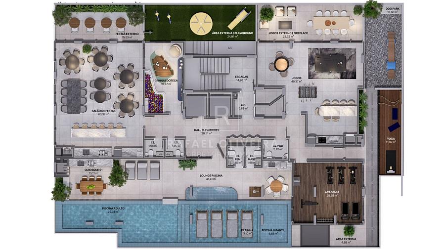 Piscina adulto e infantil, salão de festas, quiosques com churrasqueira, academia, espaço kids, playground, sala de jogos, espaço pet, espaço zen, fire place, espaço yoga.