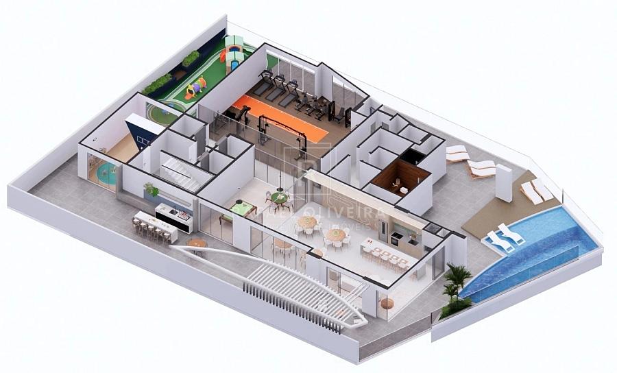 Área de lazer com 751m² com piscina adulto e infantil, prainha, salão de festas, academia, quiosque externo, pet place, brinquedoteca.
