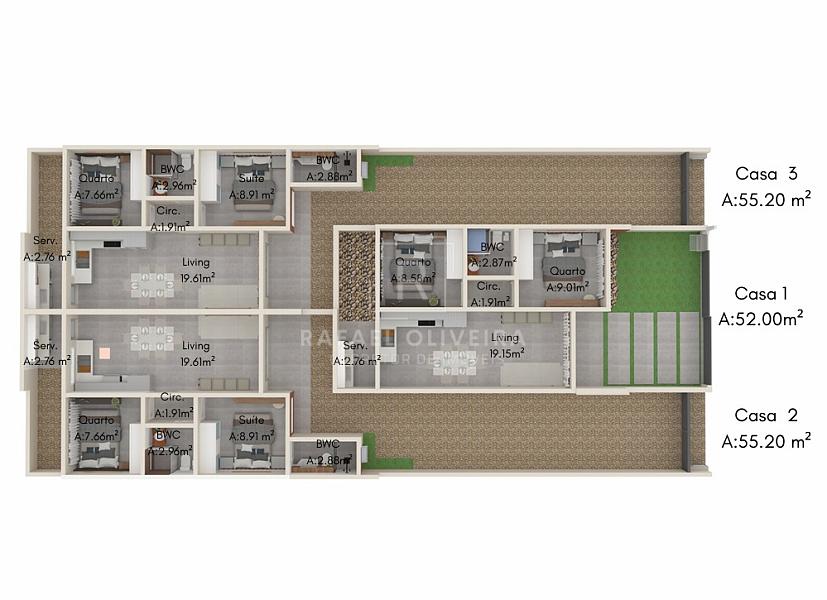 • Plantas Inteligentes: Opções de 2 dormitórios (sendo 1 suíte nas casas 2 e 3) com metragens de 52m² a 55,20m² privativos.