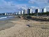A obra, executada pela DTA Engenharia, já entregou aproximadamente 1,2 km de nova faixa de areia, estendendo-se do Molhe da Getúlio Vargas em direção ao norte.